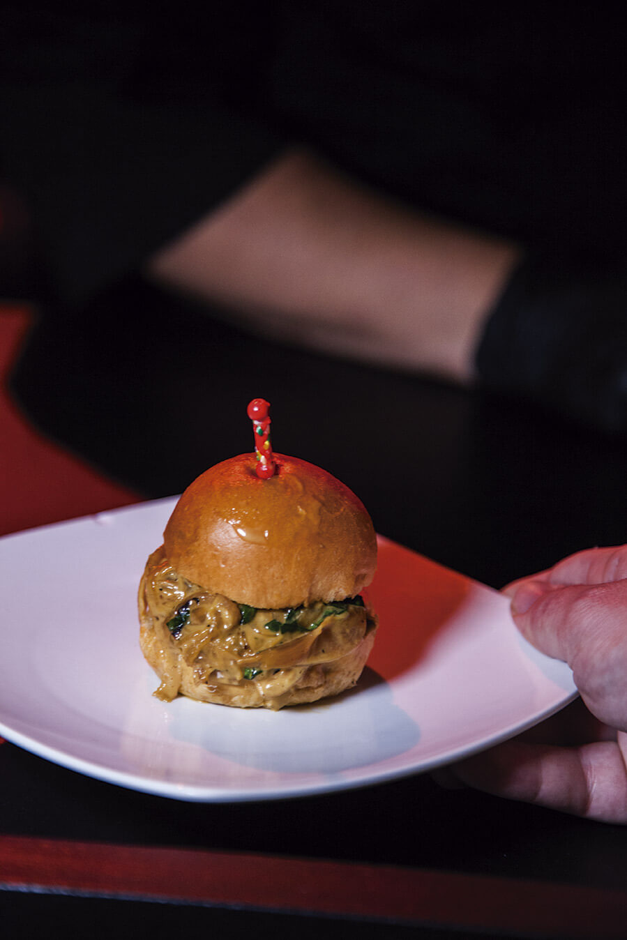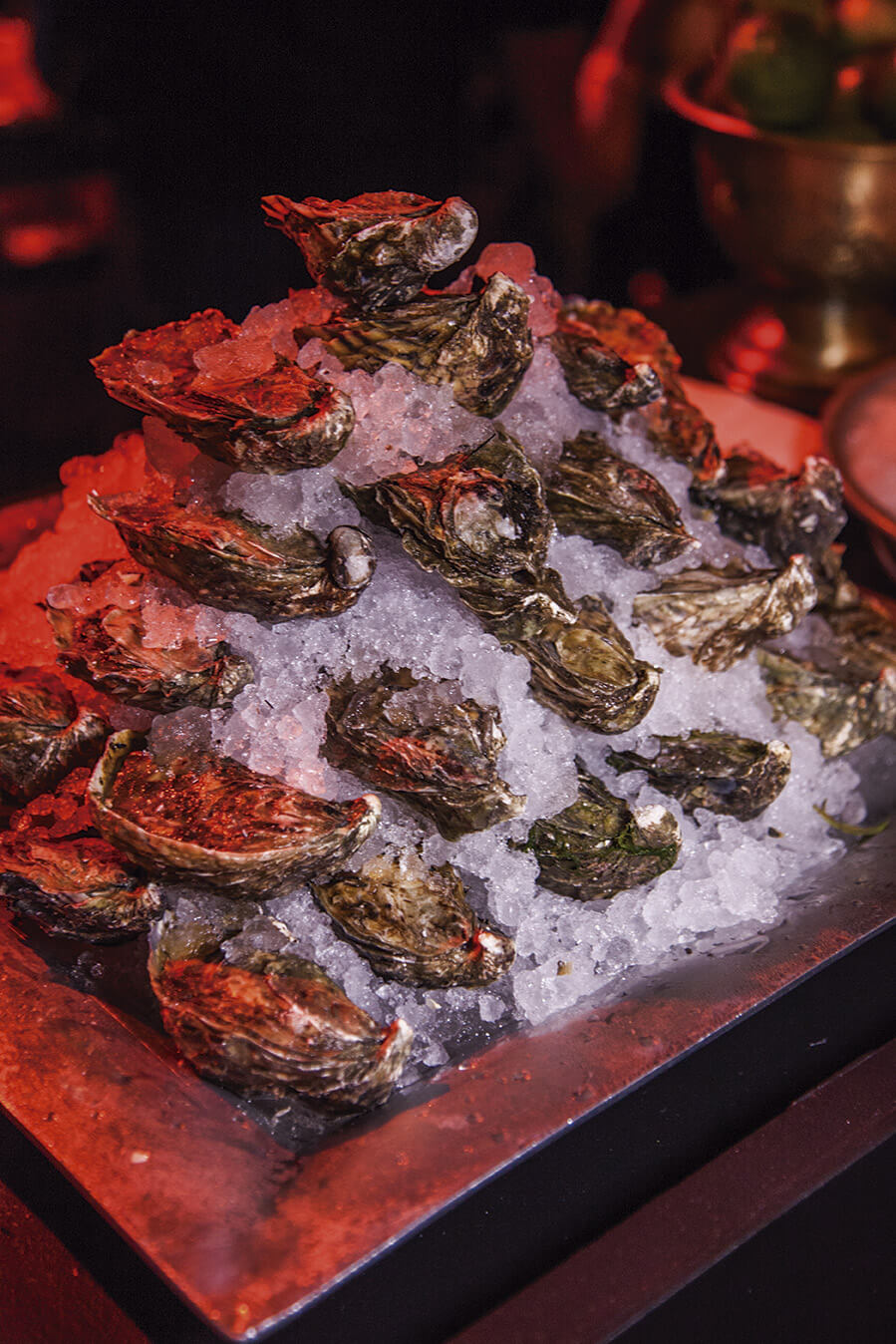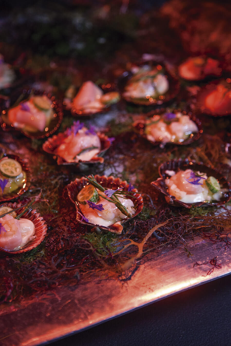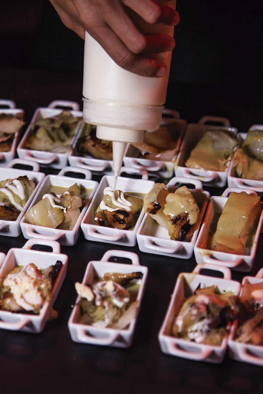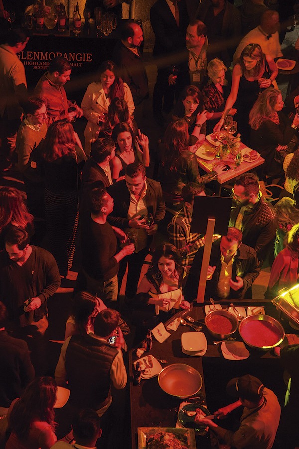 Tras la foto obligada en la alfombra roja, los invitados se encontraban con las Truffle cheeseburgers con carne premium de Creekstone Farm que preparó Aaron Mizrahi, y de ahí seguía el recorrido en el sentido de las manecilla del reloj para probar los platillos de la noche: los ostiones con atún y tapioca de Tomás Bermúdez, los tacos de cochinita pibil enterrada de David Cetina, el postre de lavanda, durazno y yogurt de Fernanda Prado, el chicharrón de coco en salsa verde y las tostadas de calamar en su tinta de Gabriela Ruiz, el callo catarina en su concha que sirvió Javier Plasencia y la col a las brasas con crema de rancho, queso Ocosingo y pipián verde de Pablo Salas. Cada plato ejecutado con el estilo que distingue a los chefs.
