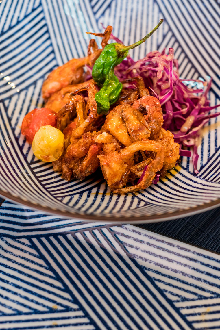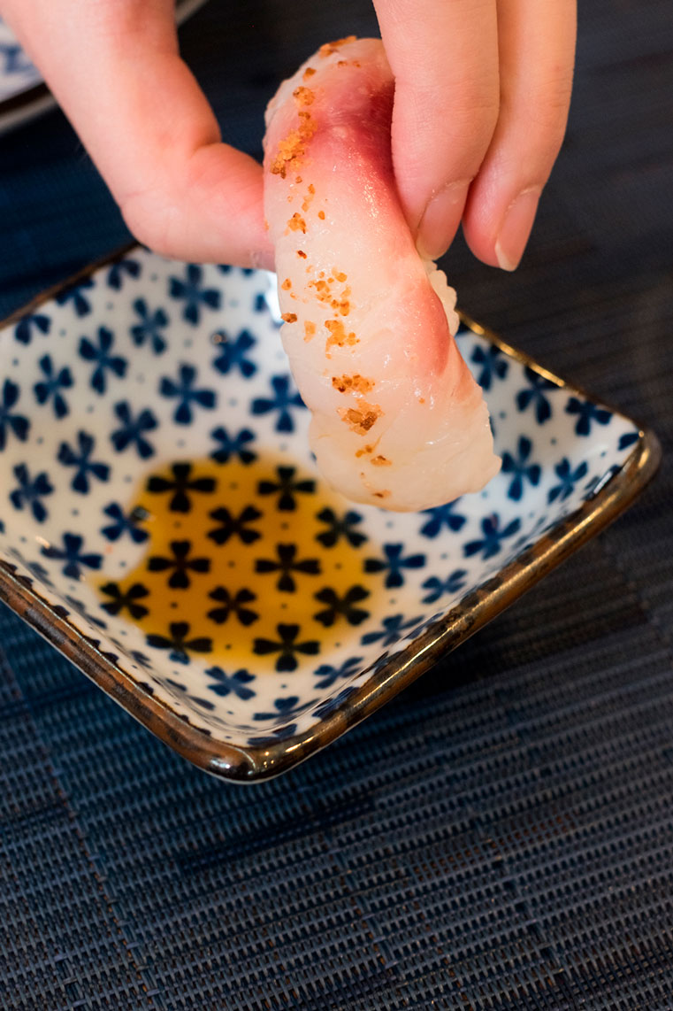 La carta fue ideada por el chef Óscar Magaña, quien pasó por las cocinas de Teppan Grill, Yoshimi y Asai Kaiseki, en las que aprendió las técnicas de las preparaciones tradicionales japonesas. Pero, cómo él nos explicó: aunque he aprendido las técnicas japonesas, mi raices y mis referencias de comida son mexicanas, así creó una propuesta que conjugara las dos cosas.Platos como el omakase de tacos, en el que sirve cuatro tacos hechos con una base de alga nori y cuatro preparaciones distintas, demuestra su punto. El día que nosotros fuimos, sirvieron estos cuatro: de kampachi con tempura de aguacate; de rib eye con erizo; de callo de hacha (concha espina) hongos a la mantequilla y salsa spicy y por último de anguila con foie gras.